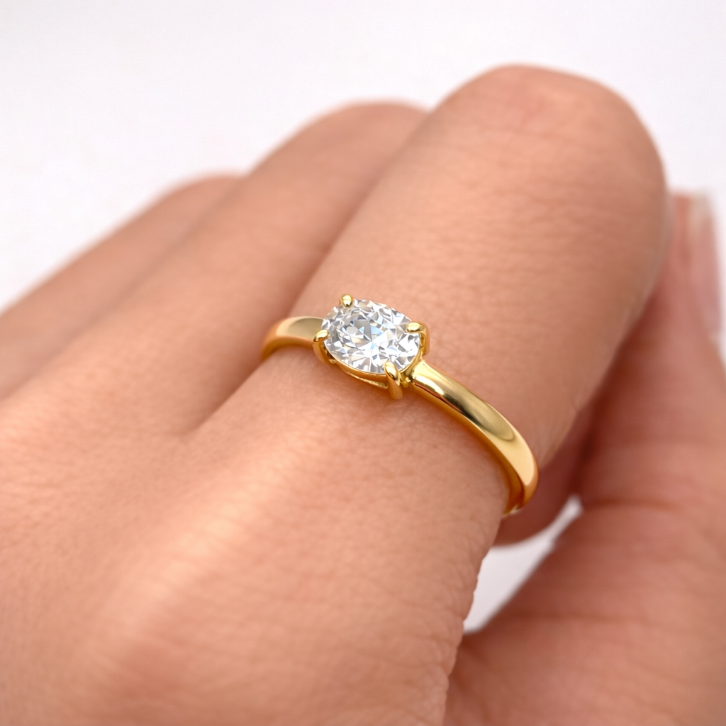 Solitaire Diamond Gold Ring, Oval Solitaire Ring, Horizontal Diamond Ring