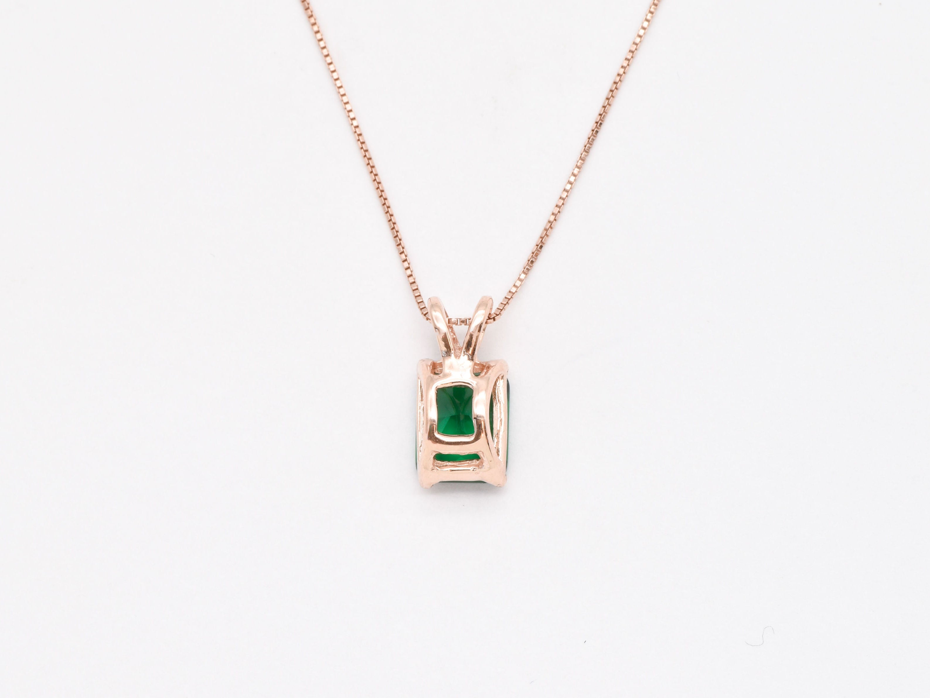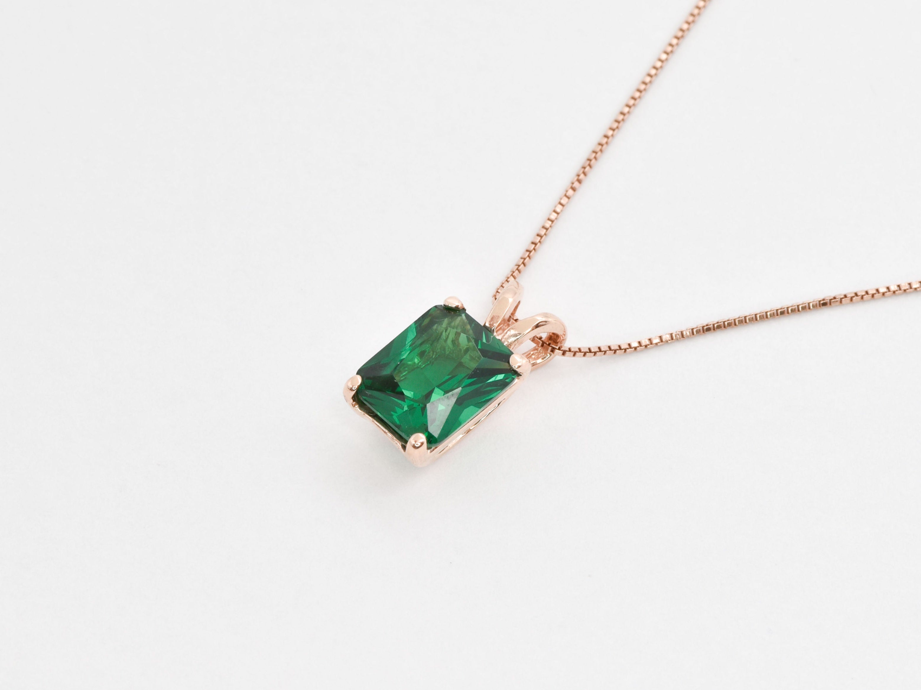 Details:• Created Emerald in a flawless clarity• Emerald: 10x8mm, 3 Cts, diamond cut• Dimensions: Pendant Height 15.3mm, Width 8mm• Free Complimentary Chain• 18k Rose Gold VermeilSKU 1059