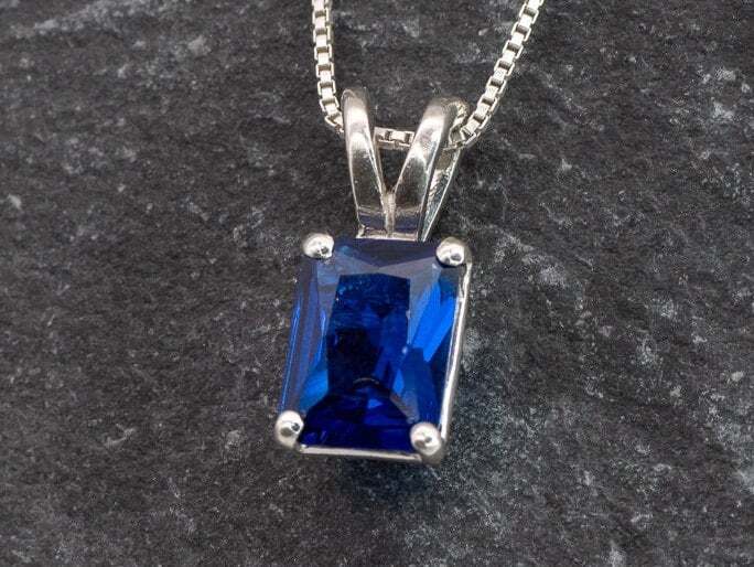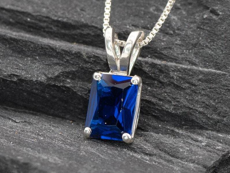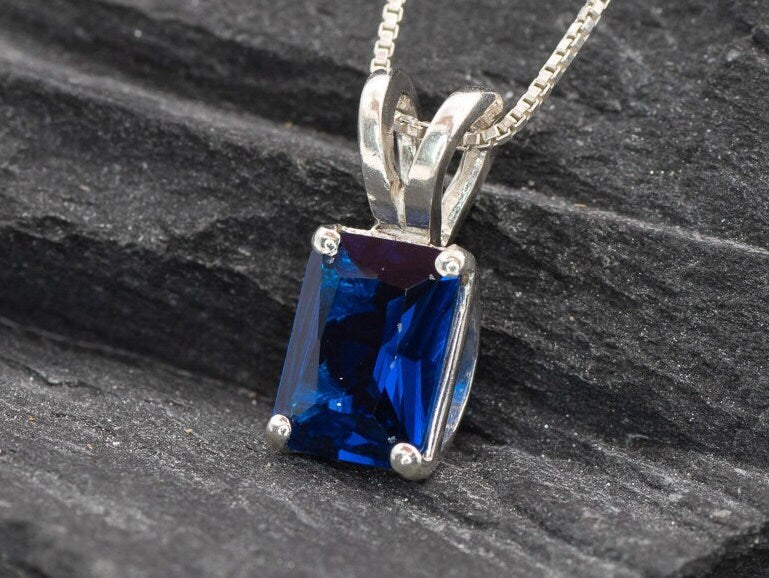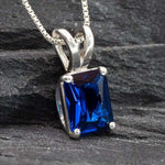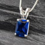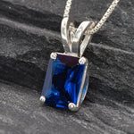 Square Sapphire Pendant set with a Created Sapphire in a flawless clarity, emerald cut & royal blue color, 8x6mm, 2 Cts.