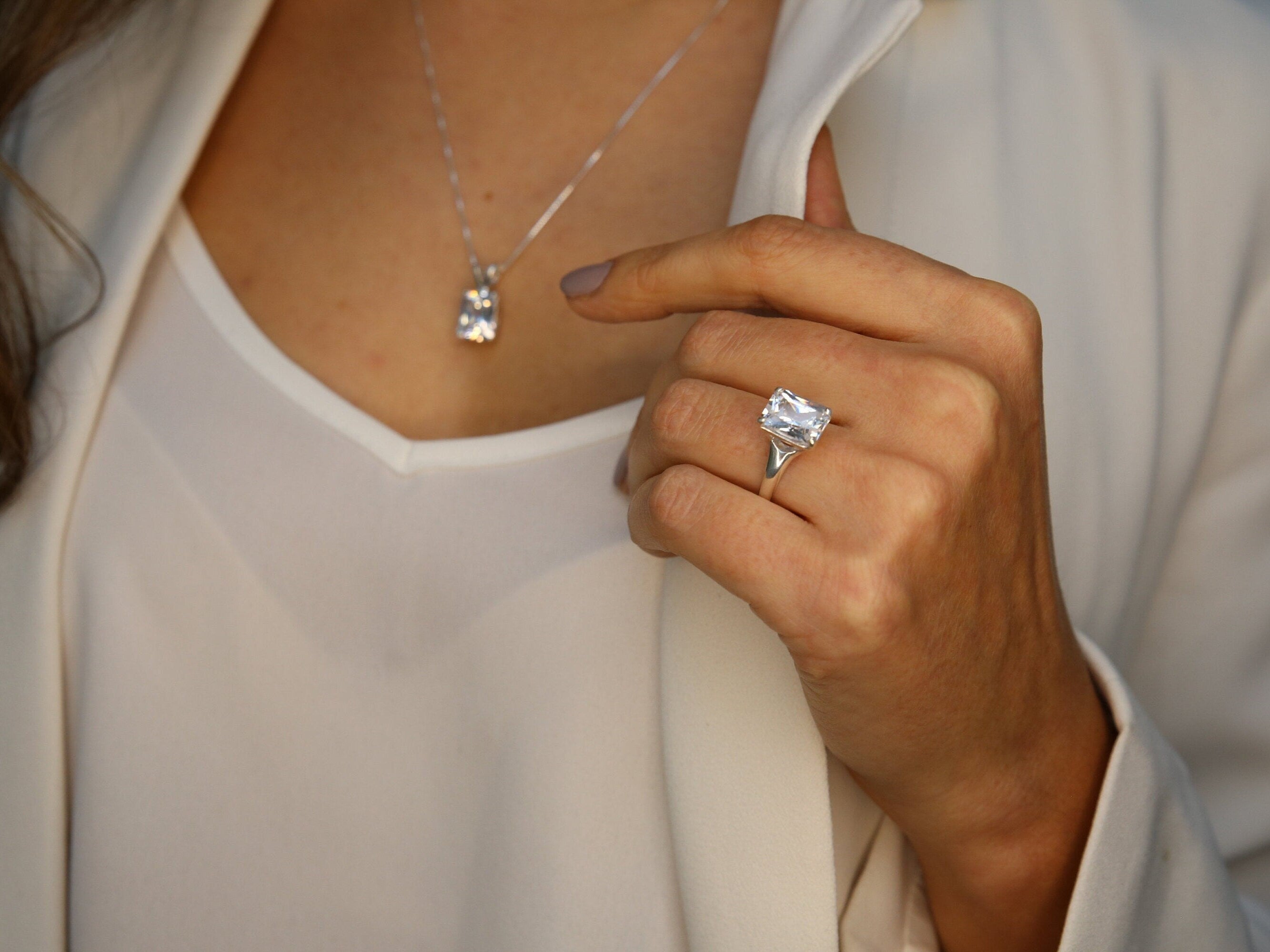 Green Diamond Ring - Silver Emerald Ring - Green Engagement Ring