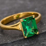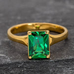 Gold Emerald Ring set with created emerald in a flawless clarity & stunning green color, at size 8x6mm (2 Cts).