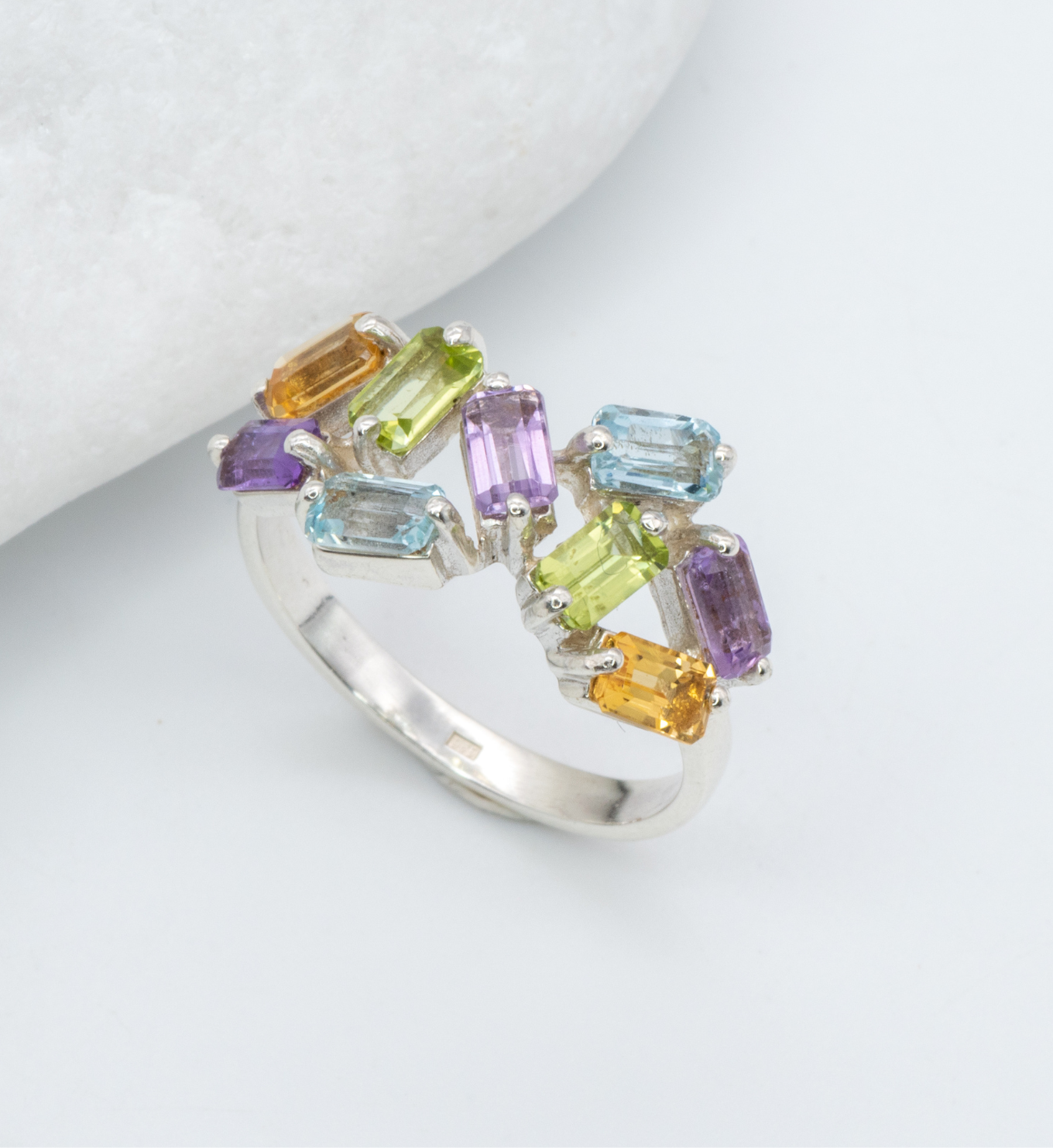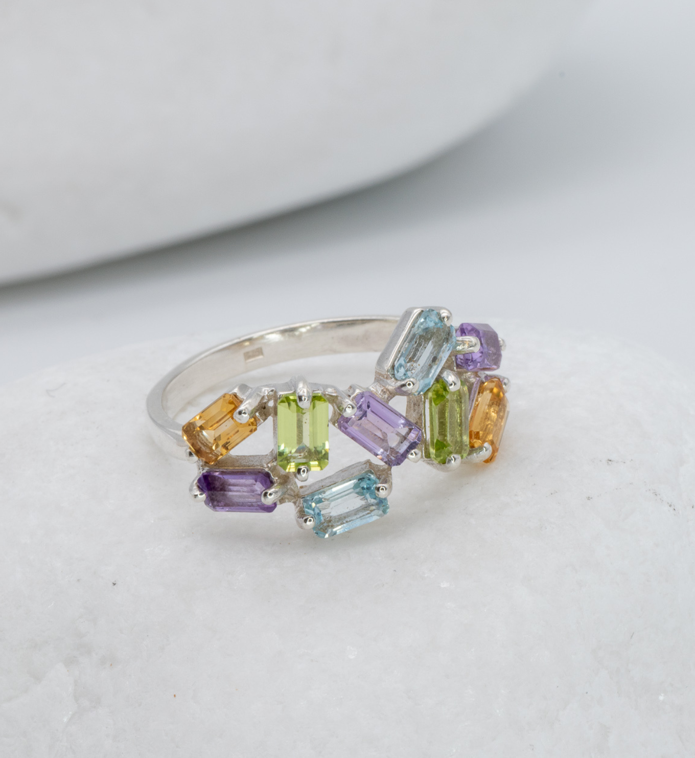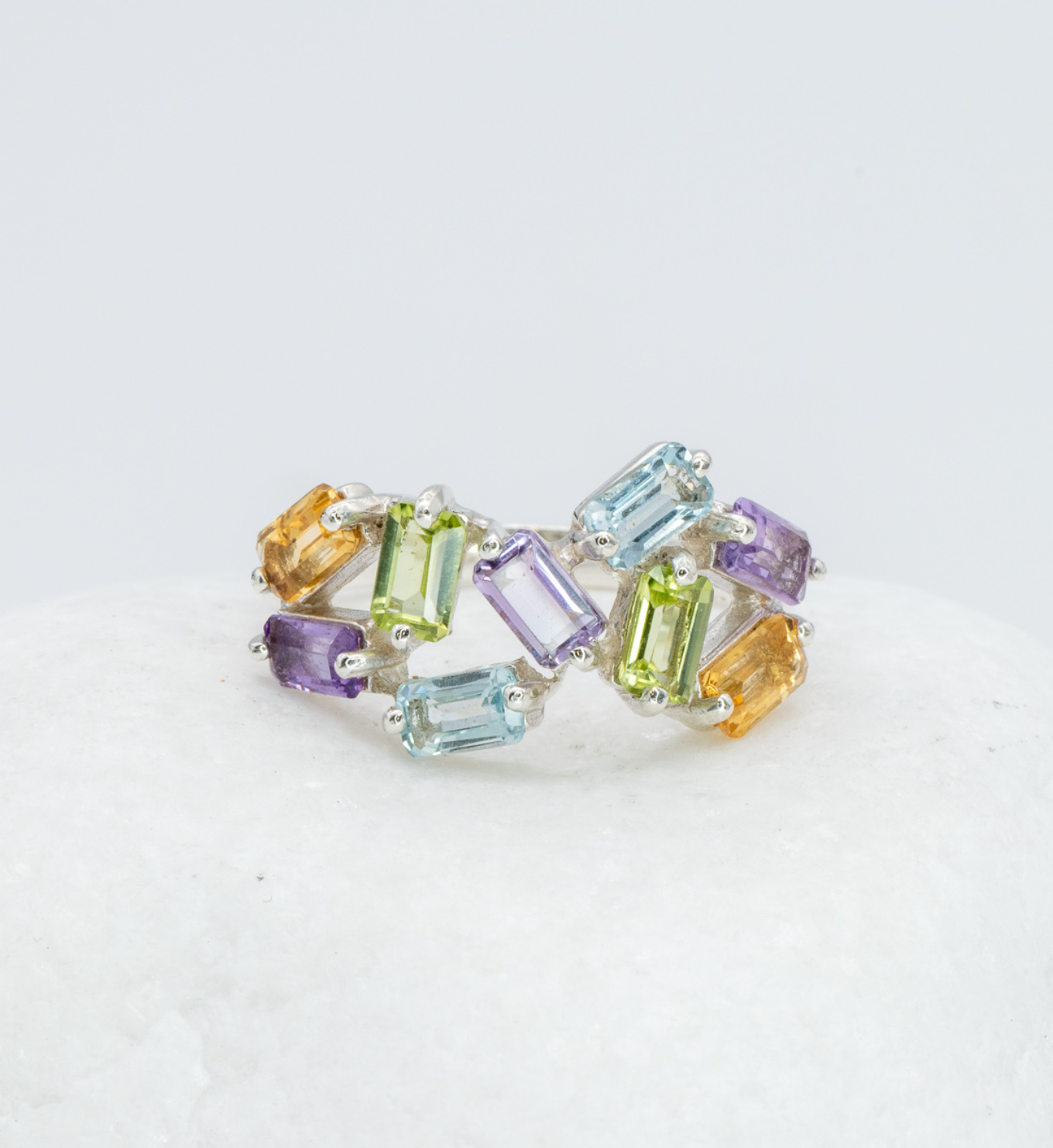 Looking for a bright and vibrant ring? This multi stone ring is set with dainty baguette stones and rich combination of colors can make you feel like you’re looking at a meadow. It’s perfect to wear to make a statement!