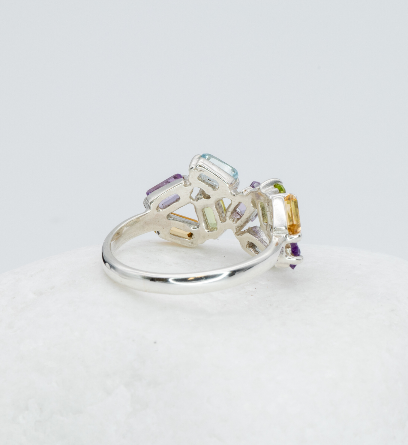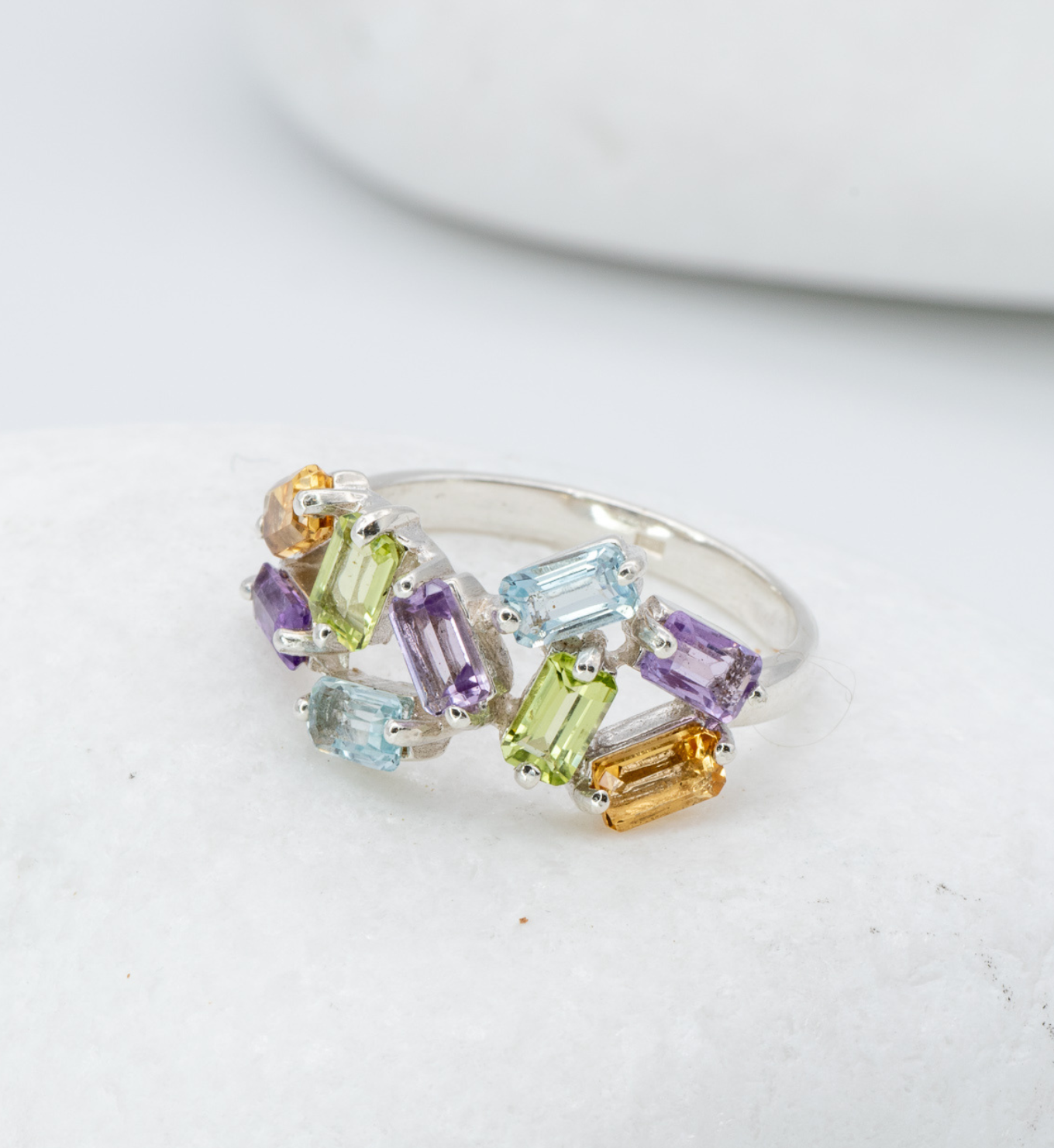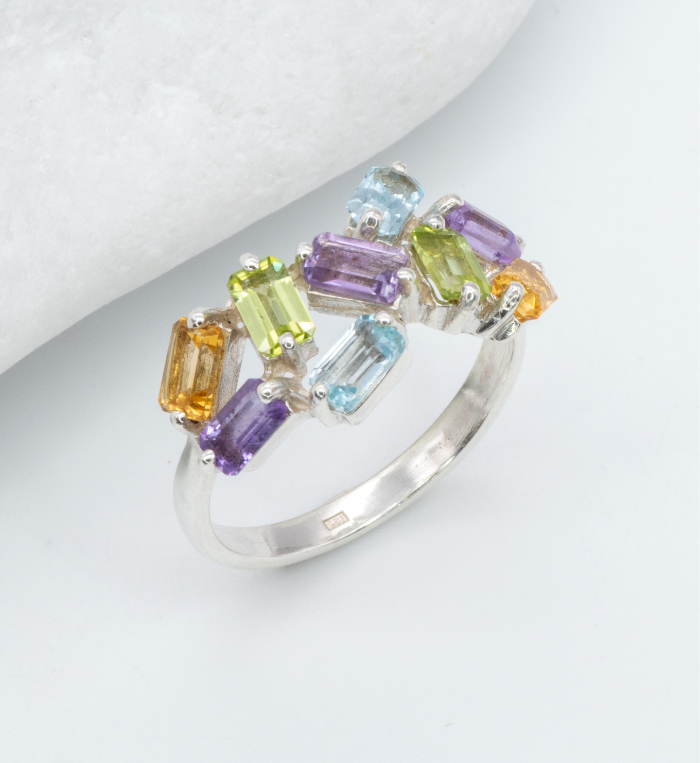 Looking for a bright and vibrant ring? This multi stone ring is set with dainty baguette stones and rich combination of colors can make you feel like you’re looking at a meadow. It’s perfect to wear to make a statement!